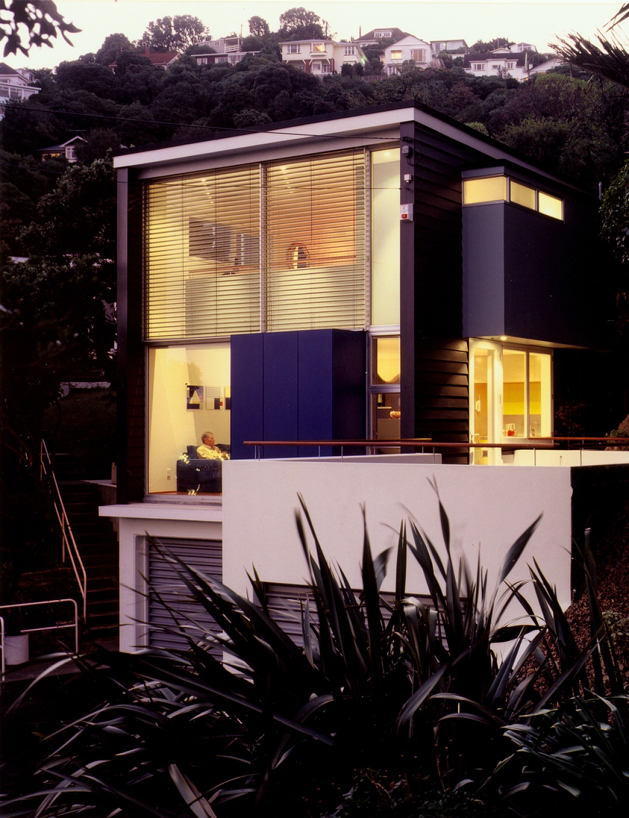 The east elevation, facing the street is mostly glazed to take advantage of the panoramic harbour and city views. A continuous void immediately behind the glass wall brings increased light and volume to the lower living space while privacy is maintained by a carefully positioned storage unit and retractable external louvres.