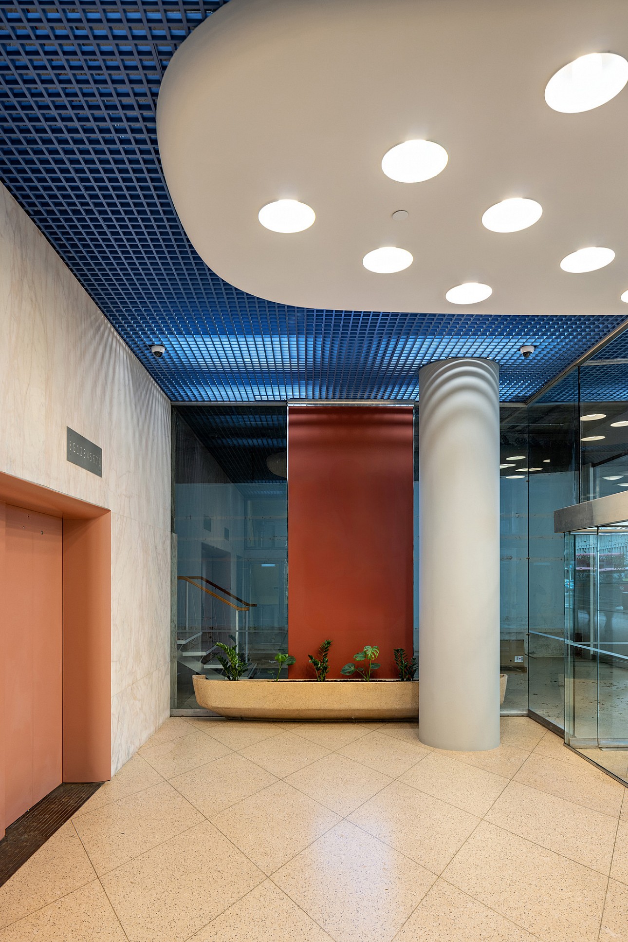 Of particular importance are the entrance lobbies to Lambton Quay and The Terrace. These spaces make a significant contribution to the streetscape, and the unique suspended curvilinear ‘clouds’ have been carefully protected and restored. Similarly, the recessed inverse ‘clouds’ to the lift lobbies and corridors have been retained and custom light fittings recreated.
